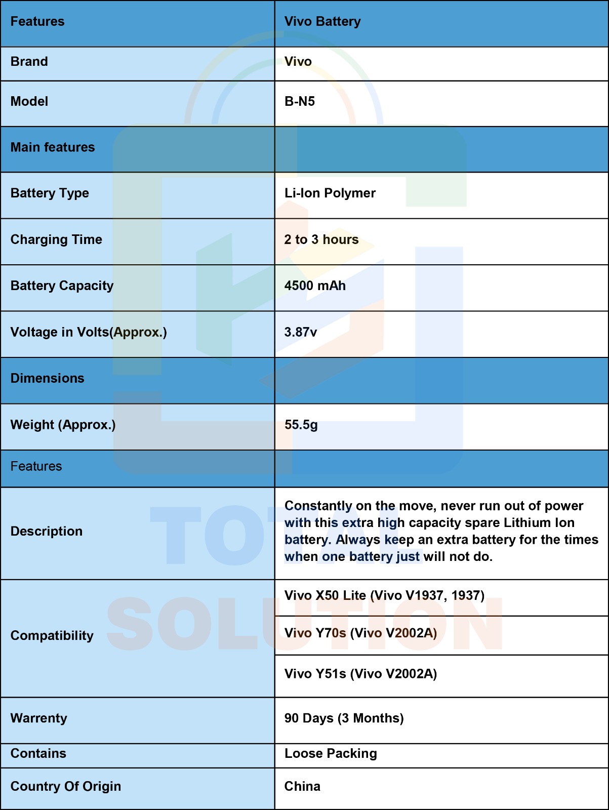 100% Original Brand New Vivo Vivo X50 Lite (V1937, 1937) / Y70s (V2002A) / Vivo Y51s (V2002A) Mobiles B-N5 BN5 Battery 4500mAh 6 months warranty