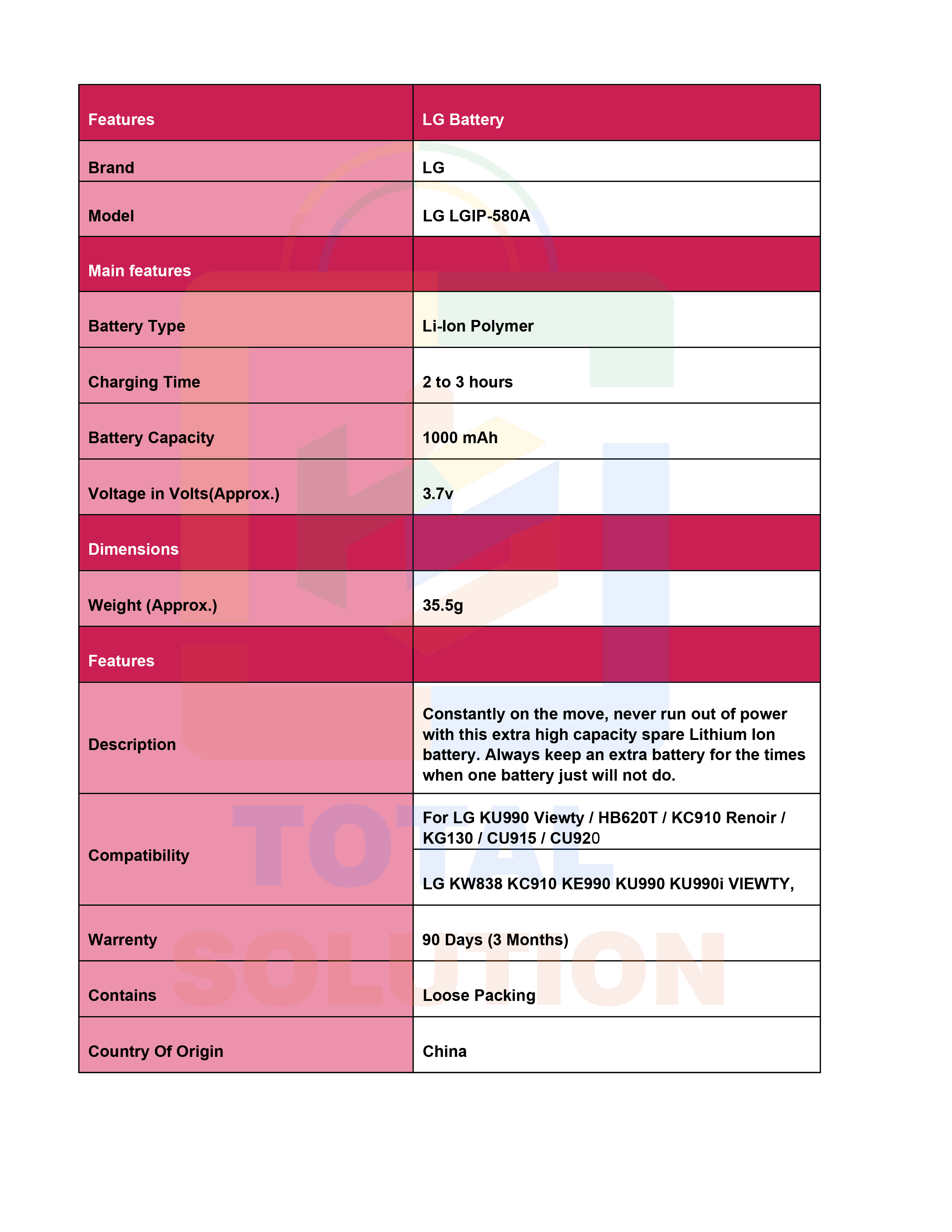 NEW Original LG LGIP-580A Battery For LG KU990 Viewty / HB620T / KC910 Renoir / KG130 / CU915 / CU920 - 1000mAh