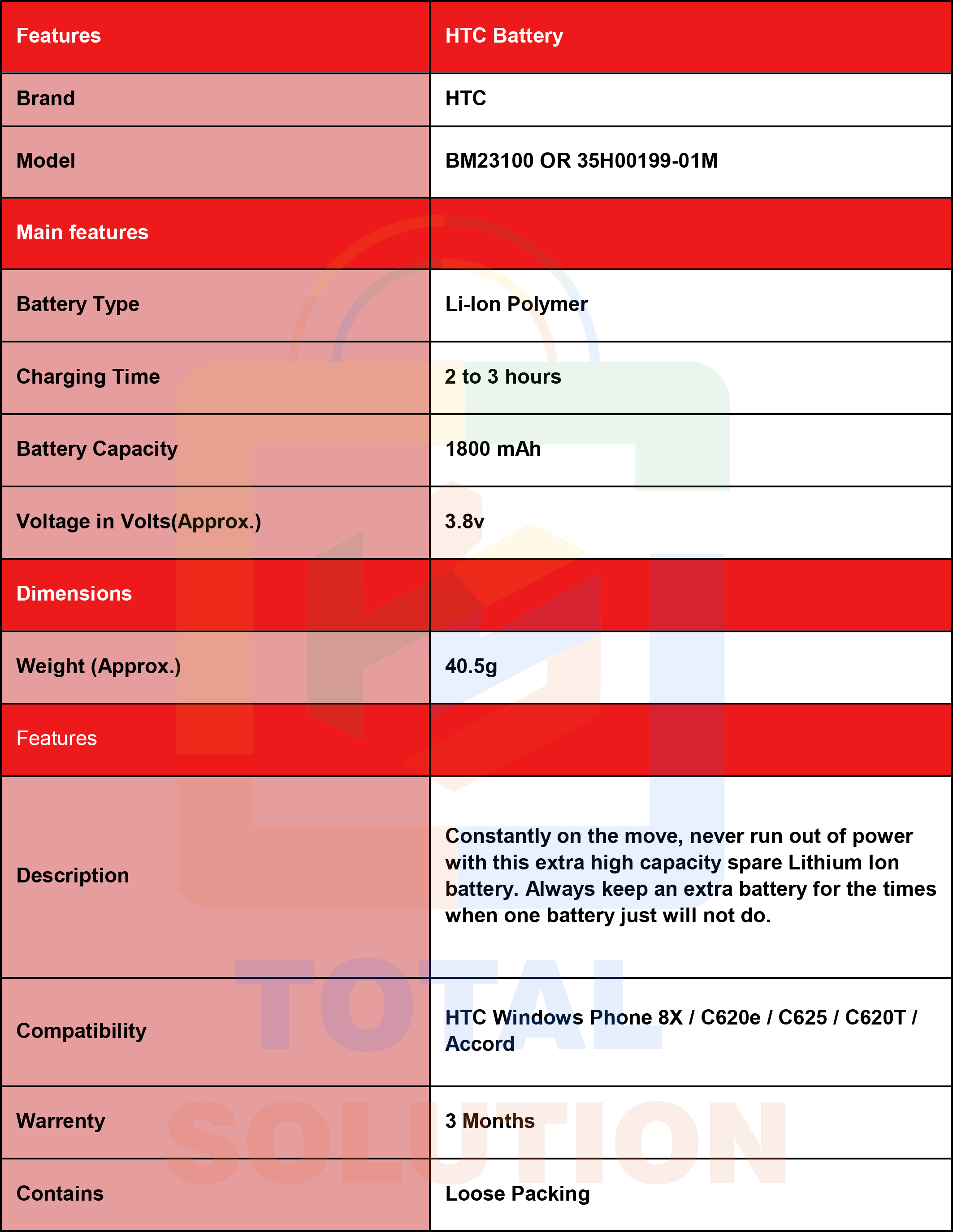 ORIGINAL BRAND NEW HTC BATTERY - BM23100 For HTC Windows 8X C620 C625 - 35H00199 BTR6990B