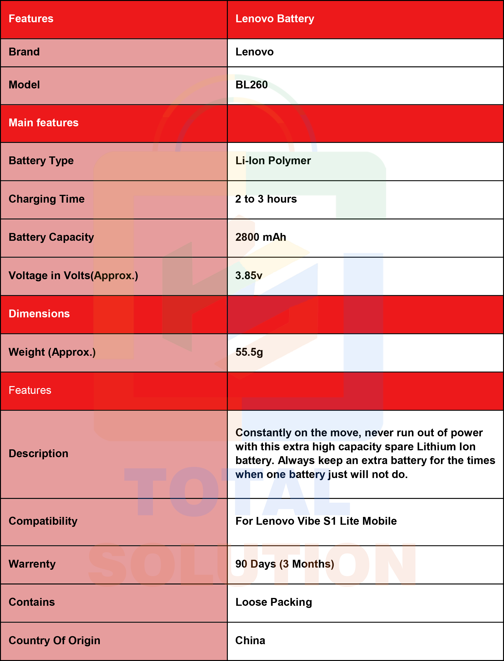 Original BRAND NEW Lenovo Battery -BL260 for Vibe S1 Lite - 2800mAh
