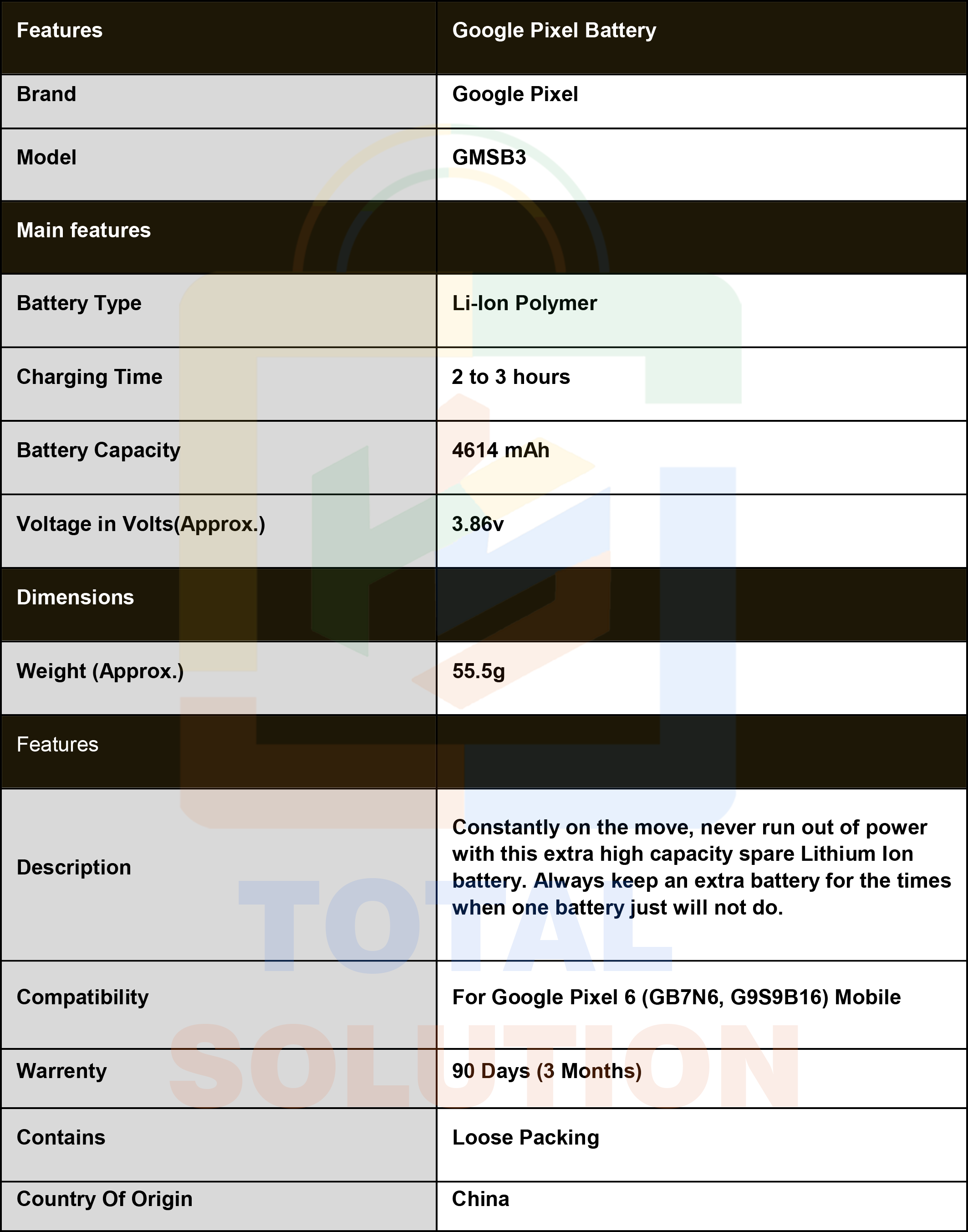 Original Google Pixel GMSB3 Battery For Google Pixel 6 ( G9S9B16) Mobile - 4614mAh