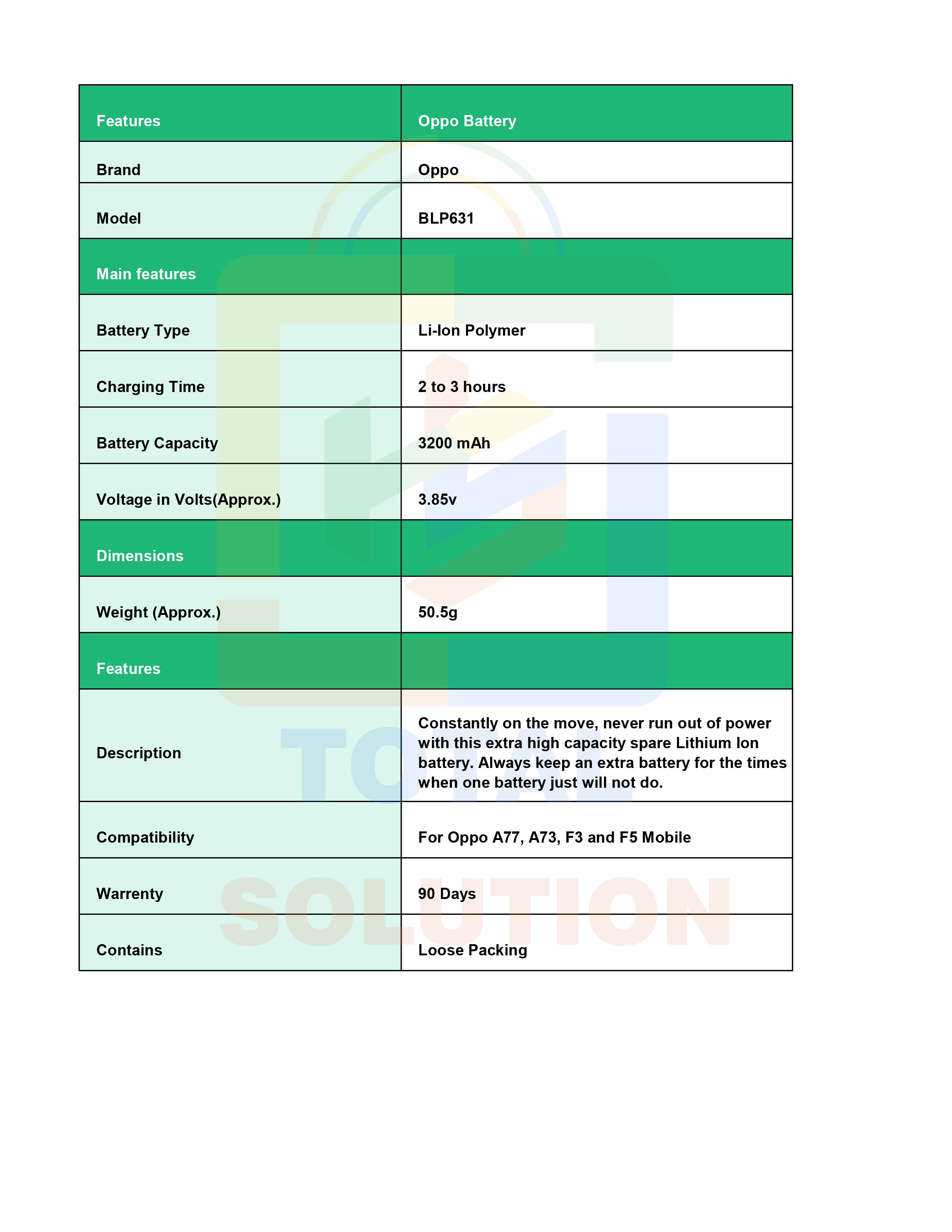 Original Oppo BLP631 Battery For Oppo A77, A73, F3 and F5 - 3200mAh