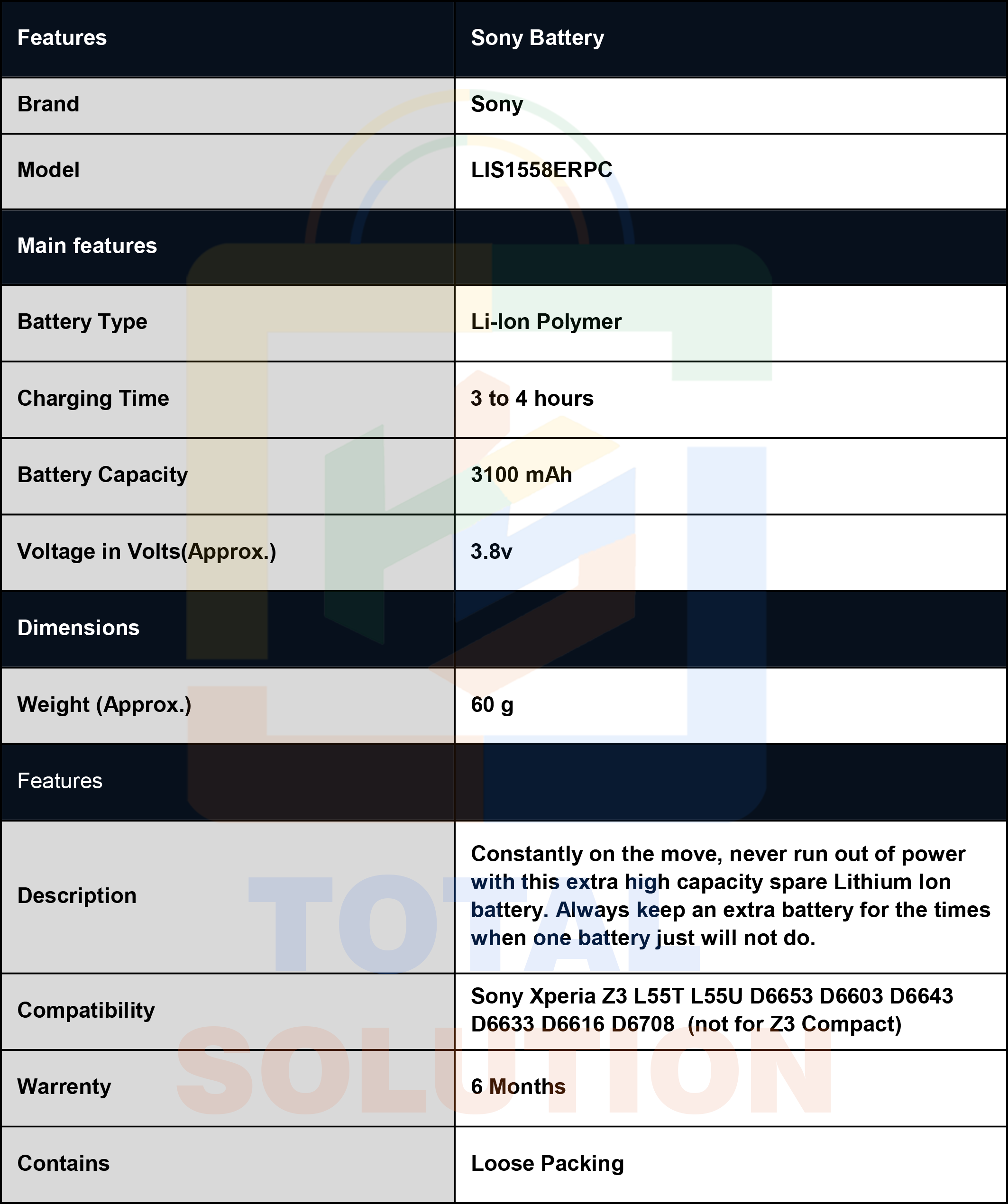 100% BRAND NEW Original Sony Battery - LIS1558ERPC , Sony Xperia Z3 3100mAh