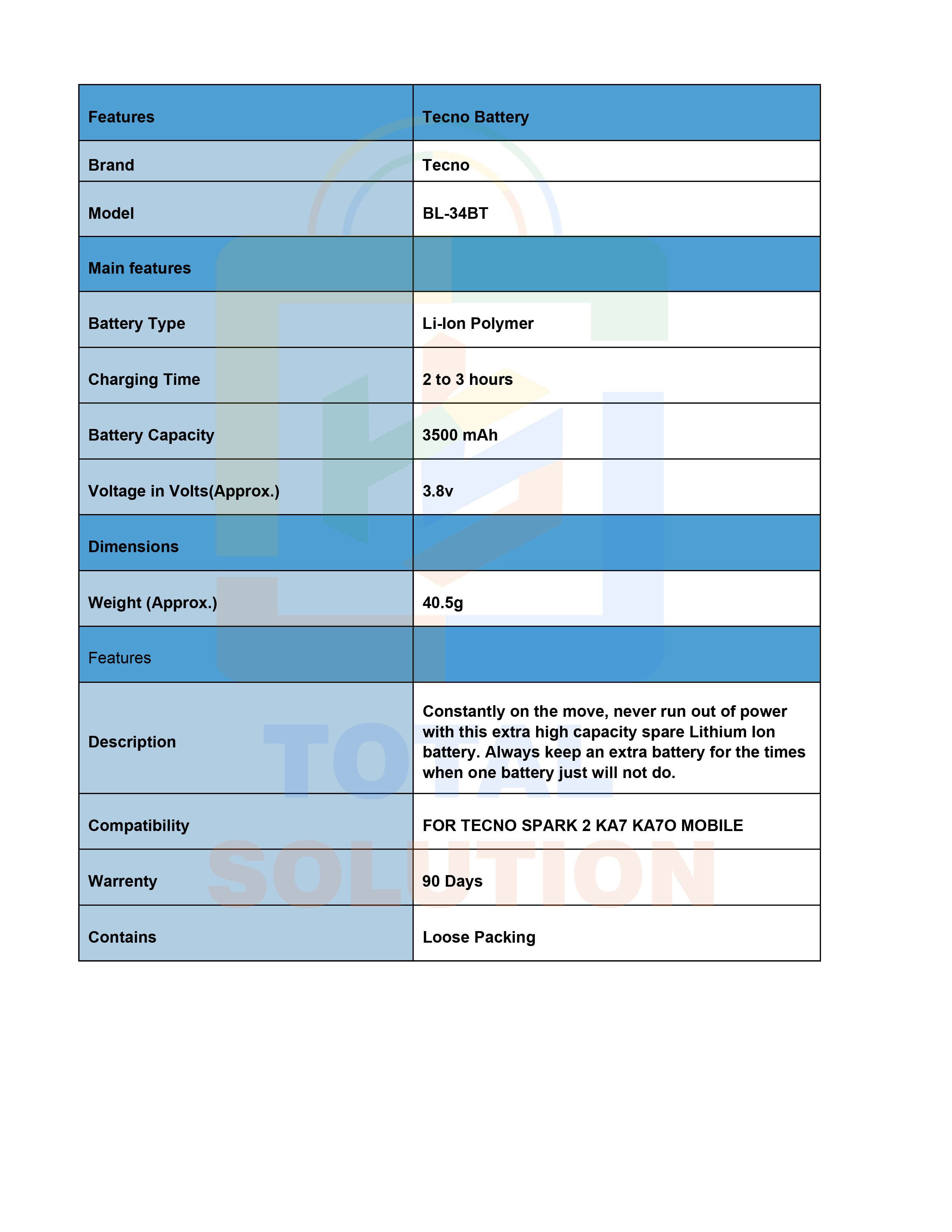 100% BRAND NEW ORIGINAL TECNO BL-34BT BATTERY FOR TECNO SPARK 2 KA7 KA7O MOBILE - 3500mAh