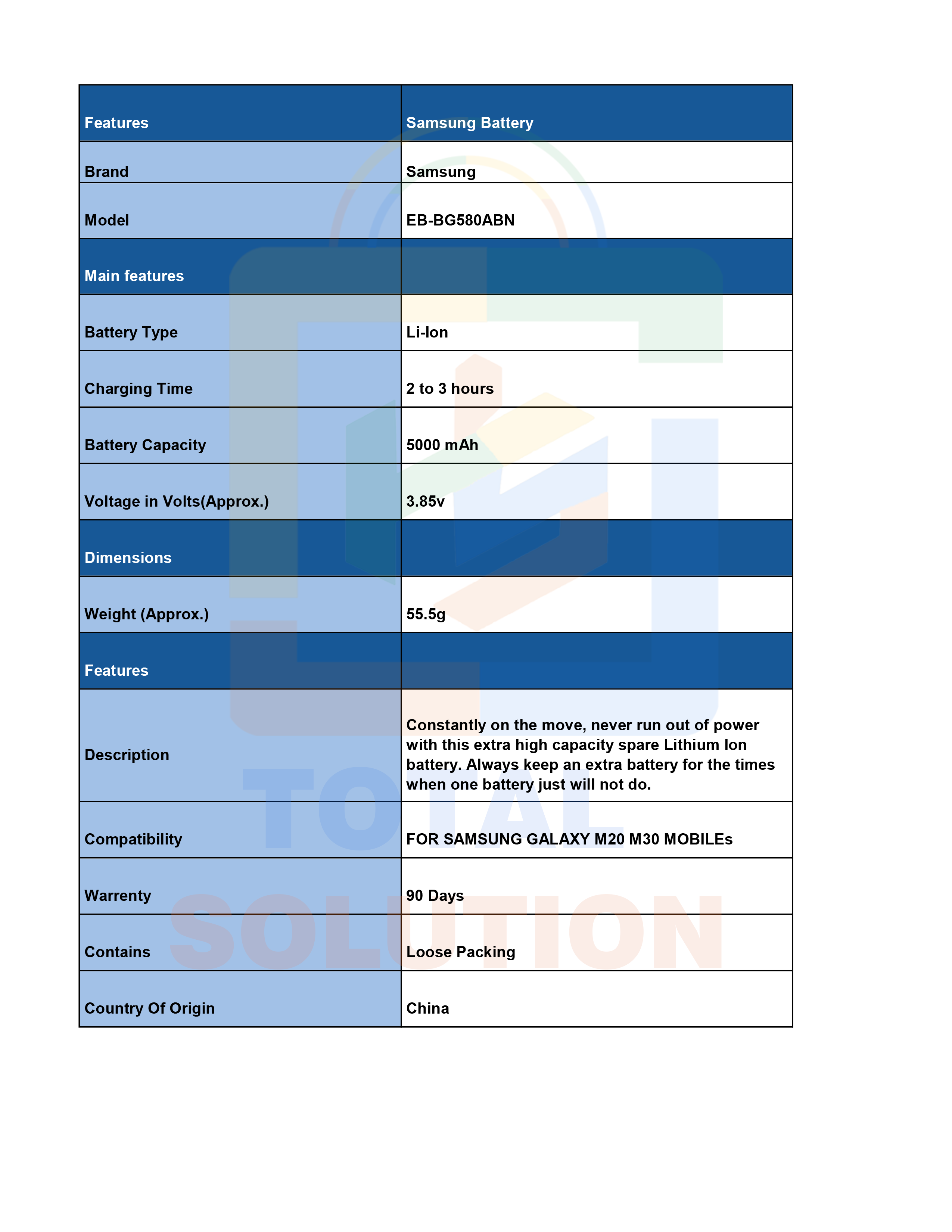 100% Original Samsung EB-BG580ABN Battery For Samsung Galaxy M20 / M30 Mobile - 5000mAh