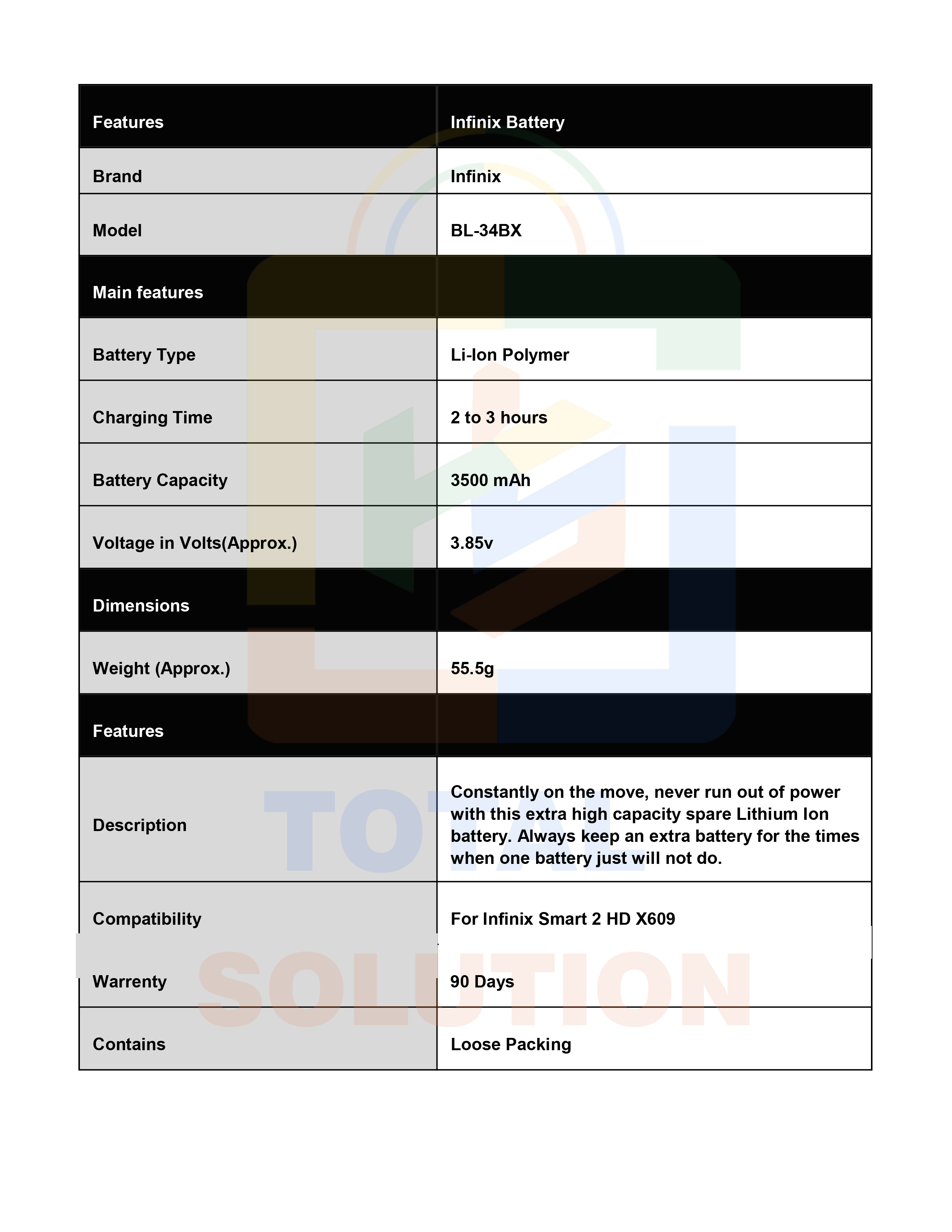 Original Infinix BL-34BX Battery For Infinix Smart 2 HD X609 Mobile BL34BX - 3500mAh