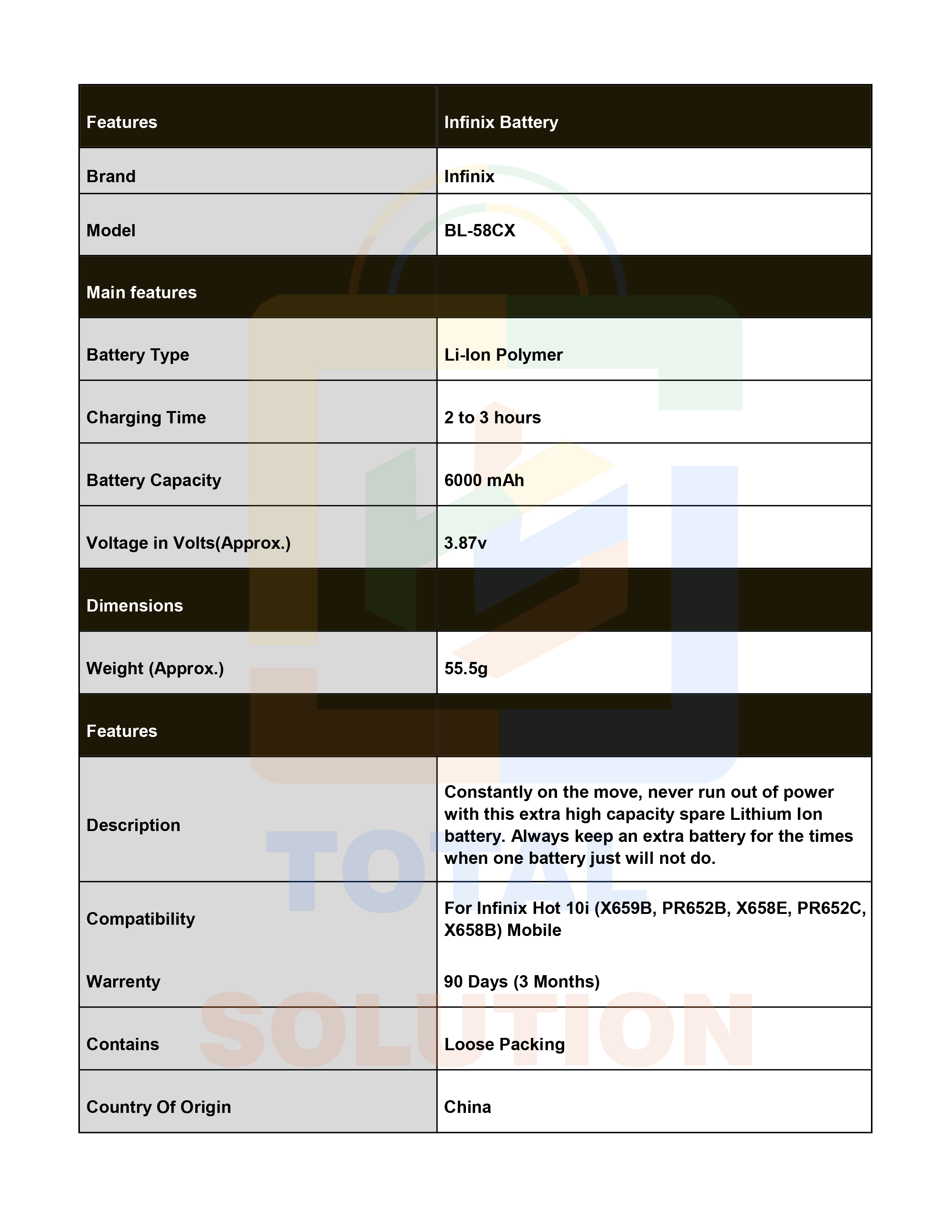 Original Infinix BL-58CX Battery For Infinix Hot 10i (X659B / X658E / X658B) Mobile - 6000mAh