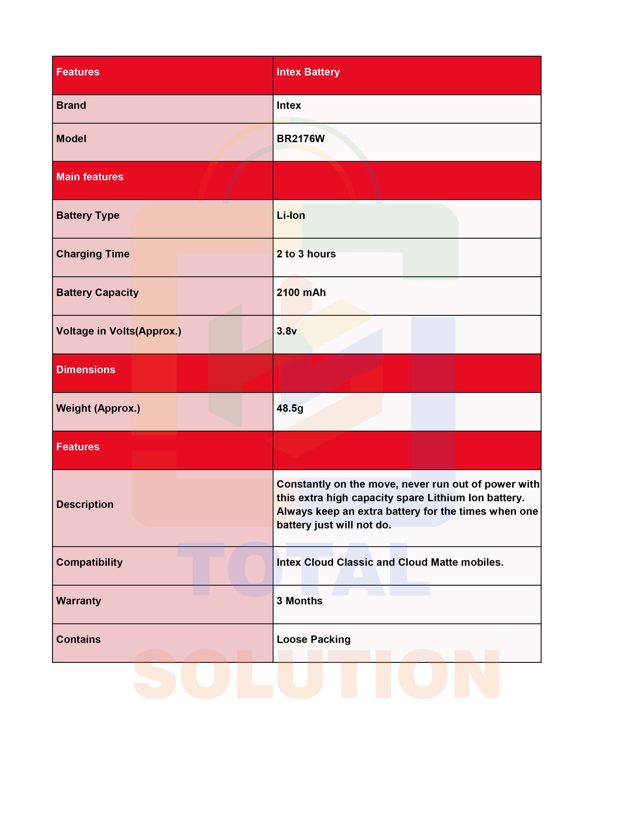 Original Intex BR2176W battery for Intex Cloud Matte with 2100 mAh and 3 months dealer warranty.