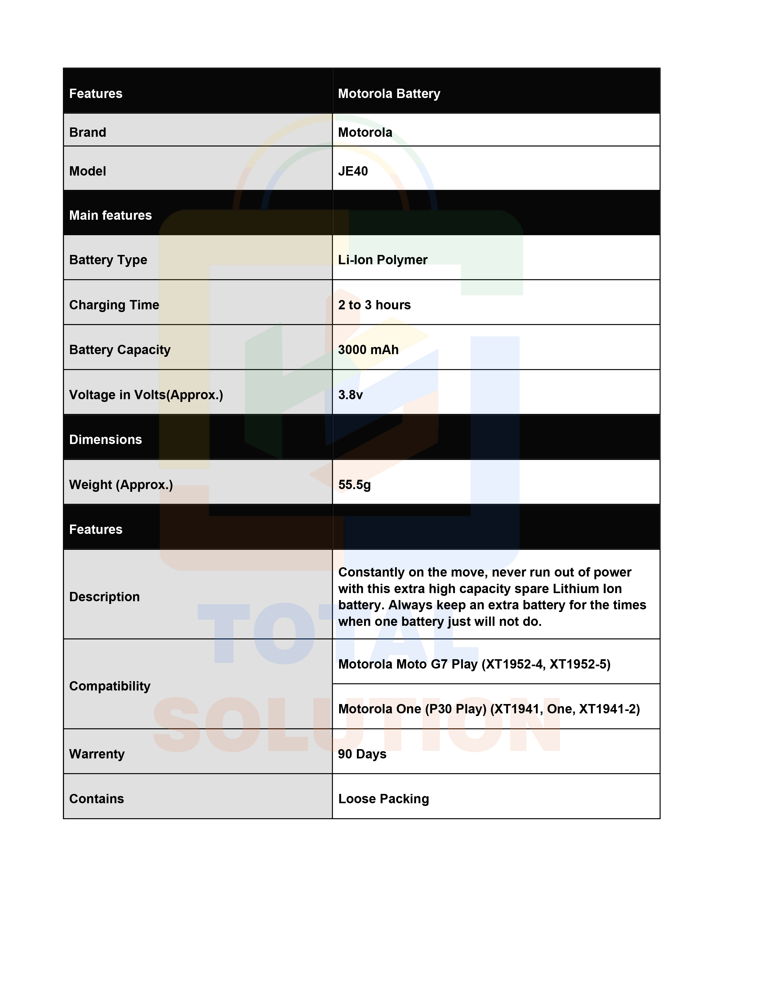 ORIGINAL JE40 BATTERY FOR MOTOROLA G7 PLAY, MOTOROLA ONE P30 PLAY - 3000mAh