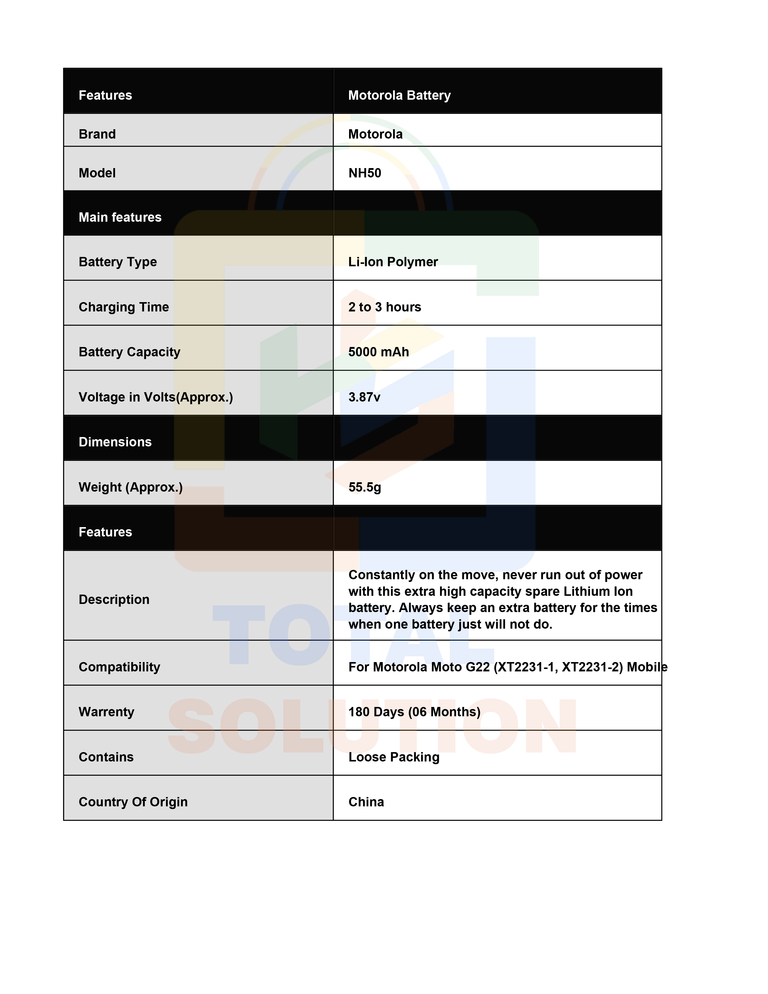 Original Motorola NH50 Battery For Moto G22 (XT2231-1, XT2231-2) Mobile - 5000mAh
