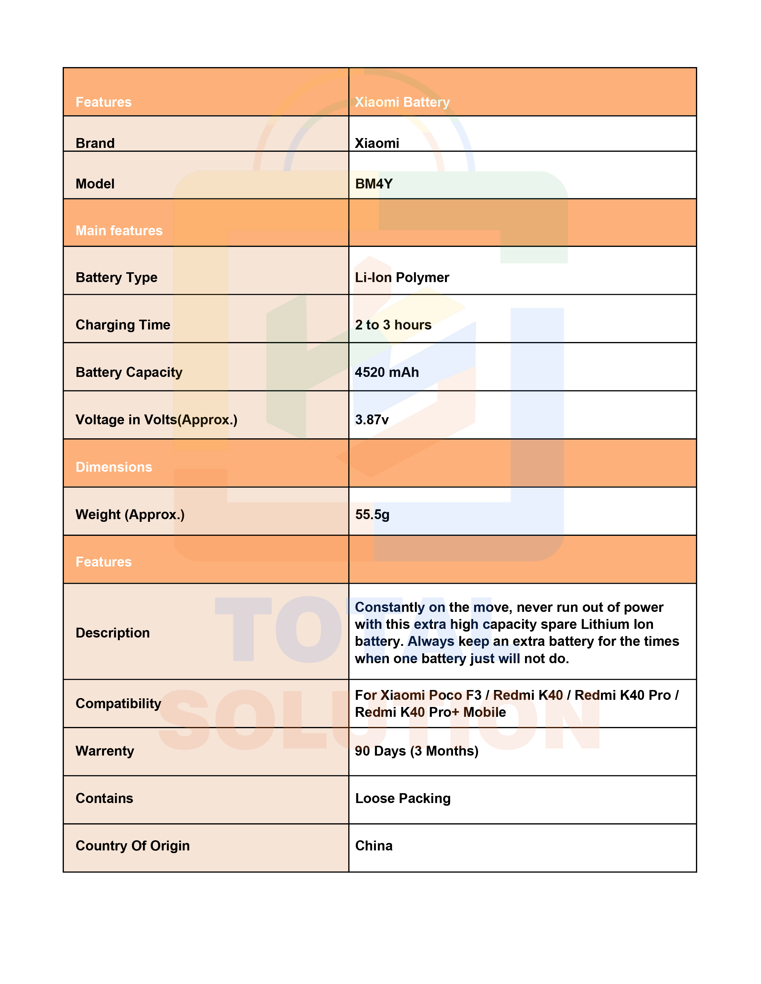 Original Xiaomi BM4Y Battery For Poco F3 / Redmi K40 / Redmi K40 Pro / Redmi K40 Pro+ - 4520mAh